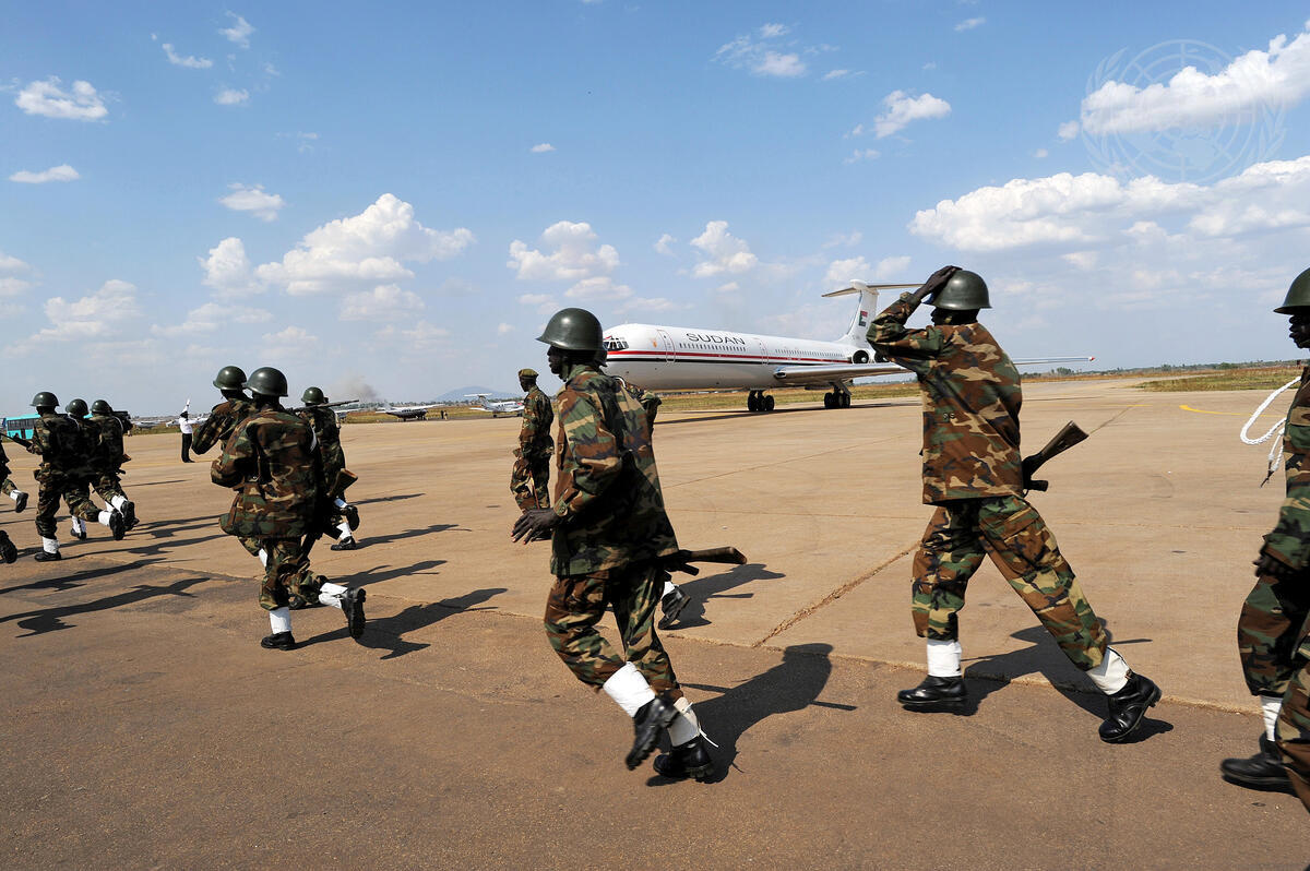 Officers of the Joint/Integrated Units of the Sudanese Armed Forces (SAF) run past the jet of President of Sudan Omer Hassan A. Al-Bashir as he leaves for Khartoum. Mr. Al-Bashir had just concluded a visit to South Sudan’s capital, Juba, less than a week before the South holds a referendum on self-determination.