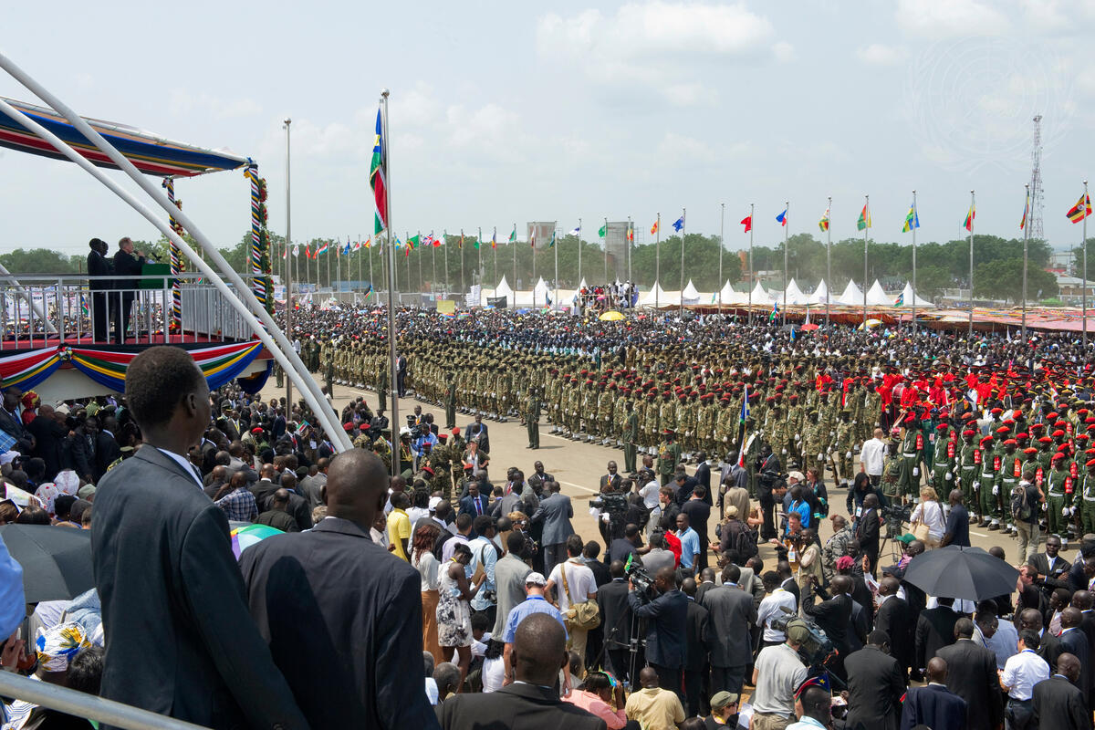 A wide view of the Independence Ceremony of the Republic of South Sudan. The flag of the new nation is raised. On the right are media crews filming the historic event.