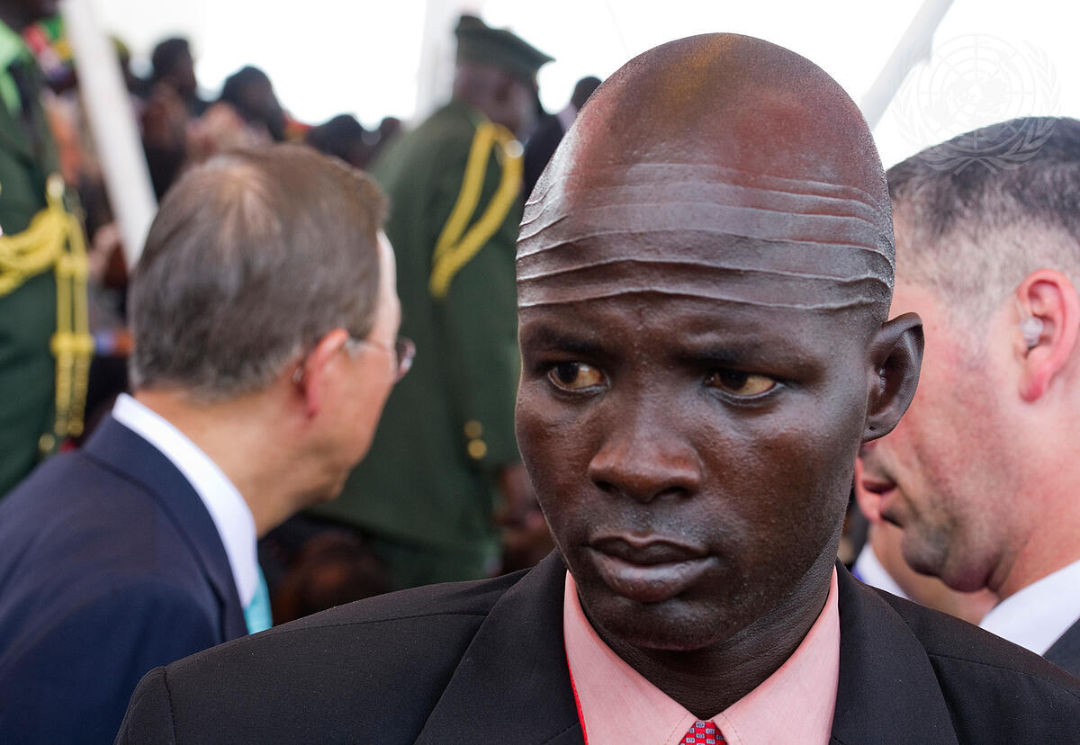 South Sudanese security guards protect the dignitaries attending the historic Independence Ceremony of the Republic of South Sudan. Secretary-General Ban Ki-moon is on the left.