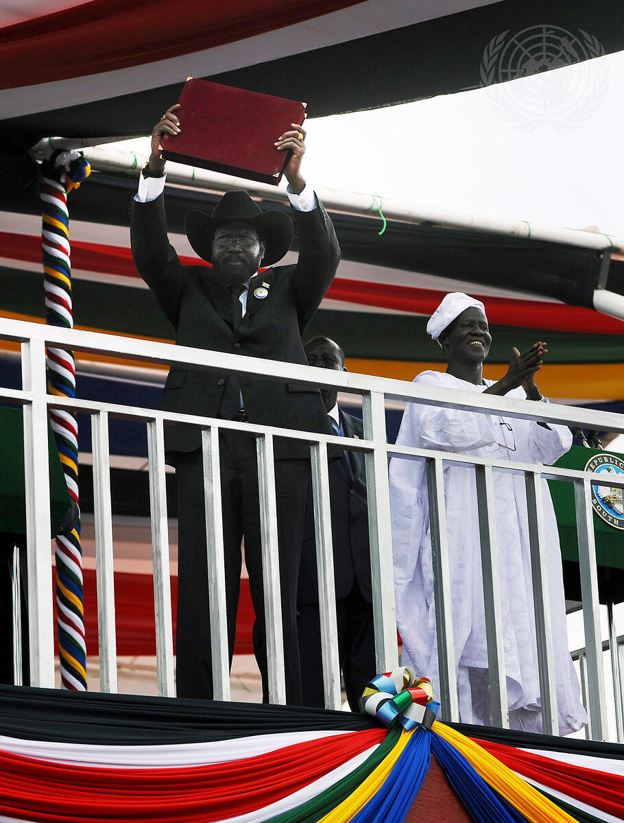 Salva Kiir Mayardit, President of the Republic of South Sudan, shows a copy of the interim constitution of the new nation he has just signed.