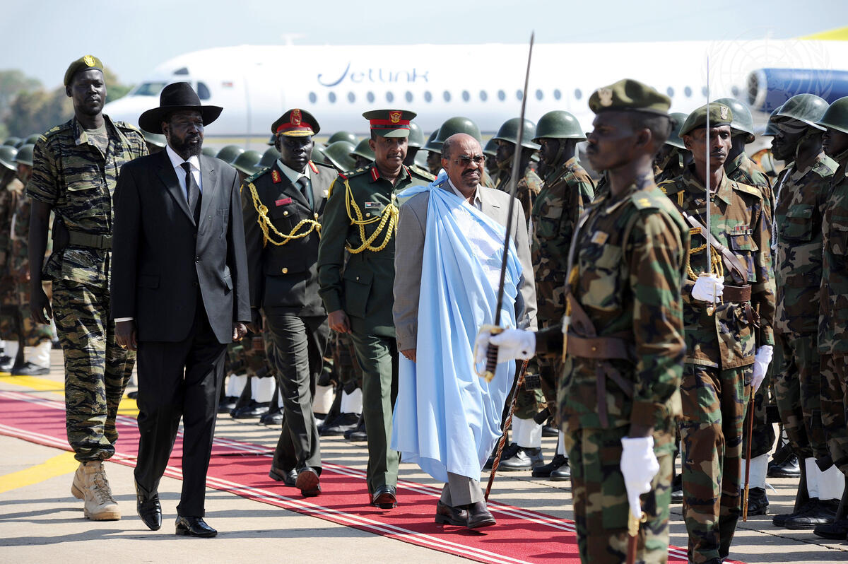 Omer Hassan A. Al-Bashir (front, in traditional South Sudanese robe), President of the Republic of the Sudan, arrives in Juba, South Sudan’s capital, less than a week before the South will hold a long-awaited referendum on self-determination. Pictured with Mr. Al-Bashir is Salva Kiir Mayardit (in black suit), First Vice President of the Republic of the Sudan and President of the Government of Southern Sudan (GOSS).