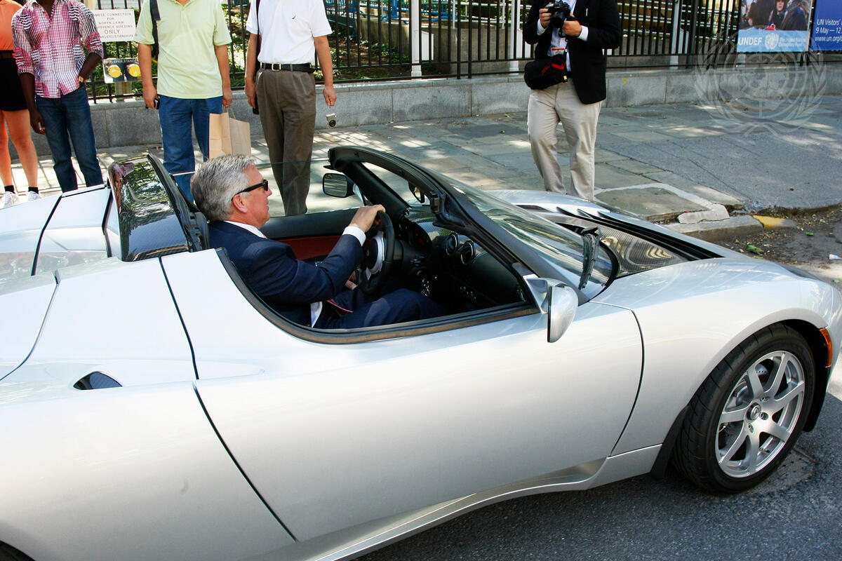 A participant of the Global Summit to Strengthen Public-Private Partnerships to Accelerate Global Electricity Technology Deployment arrives at United Nations Headquarters by an electric car. The side event is held as the UN General Assembly convenes a thematic debate today on: “Green Economy: A Pathway to Sustainable Development”.