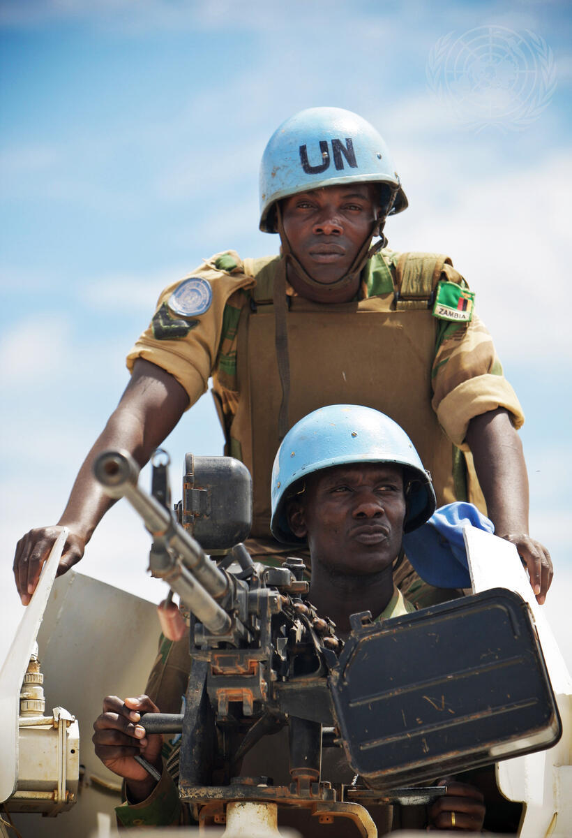 Members of the Zambian military contingent of the UN Mission in Sudan (UNMIS) prepare to depart from their mission site in an armoured personnel carrier for a patrol around Abyei town.