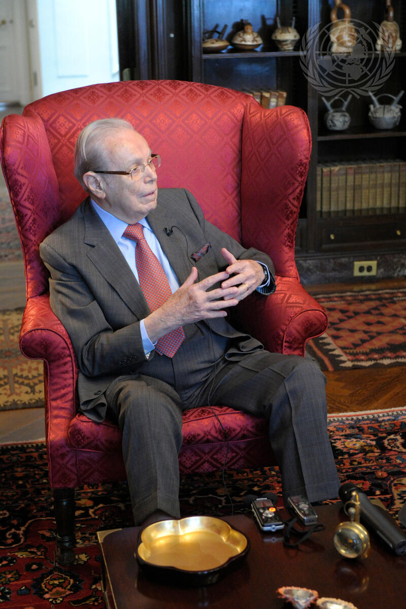 Javier Pérez de Cuéllar, former United Nations Secretary-General (Term of Office: 1982-1991) speaks to a reporter during an interview with UN Television and Radio.