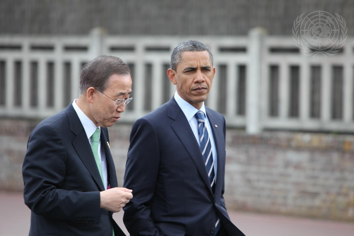 Secretary-General Ban Ki-moon (left) walks with Barack Obama, President of the United States, outside the 37th G8 Summit in Deauville, France.