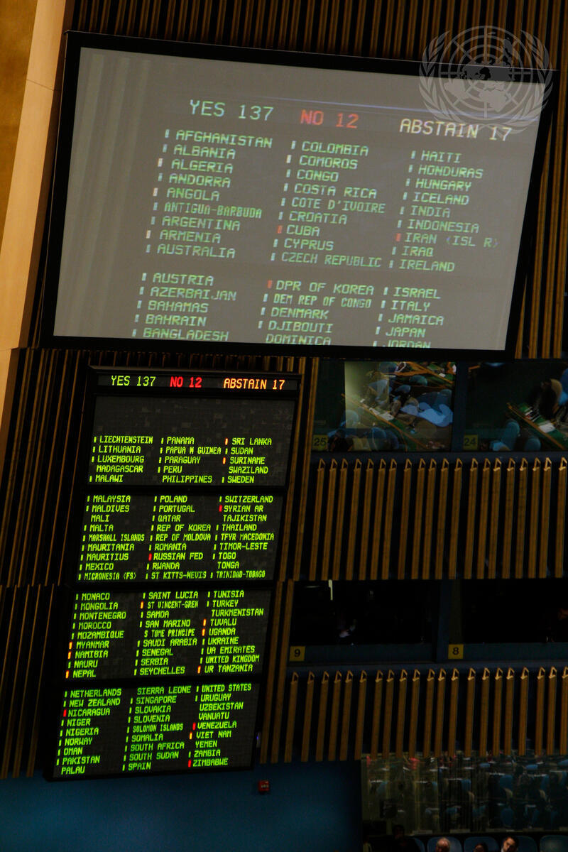 Digital boards inside the General Assembly Hall display the votes cast by Member States on a draft resolution concerning Syria. The resolution, which strongly condemns the abuses by the Syrian Government against its people and demands an end to all violence in the country, was adopted with 137 votes in favour, 12 against, and 17 abstentions.