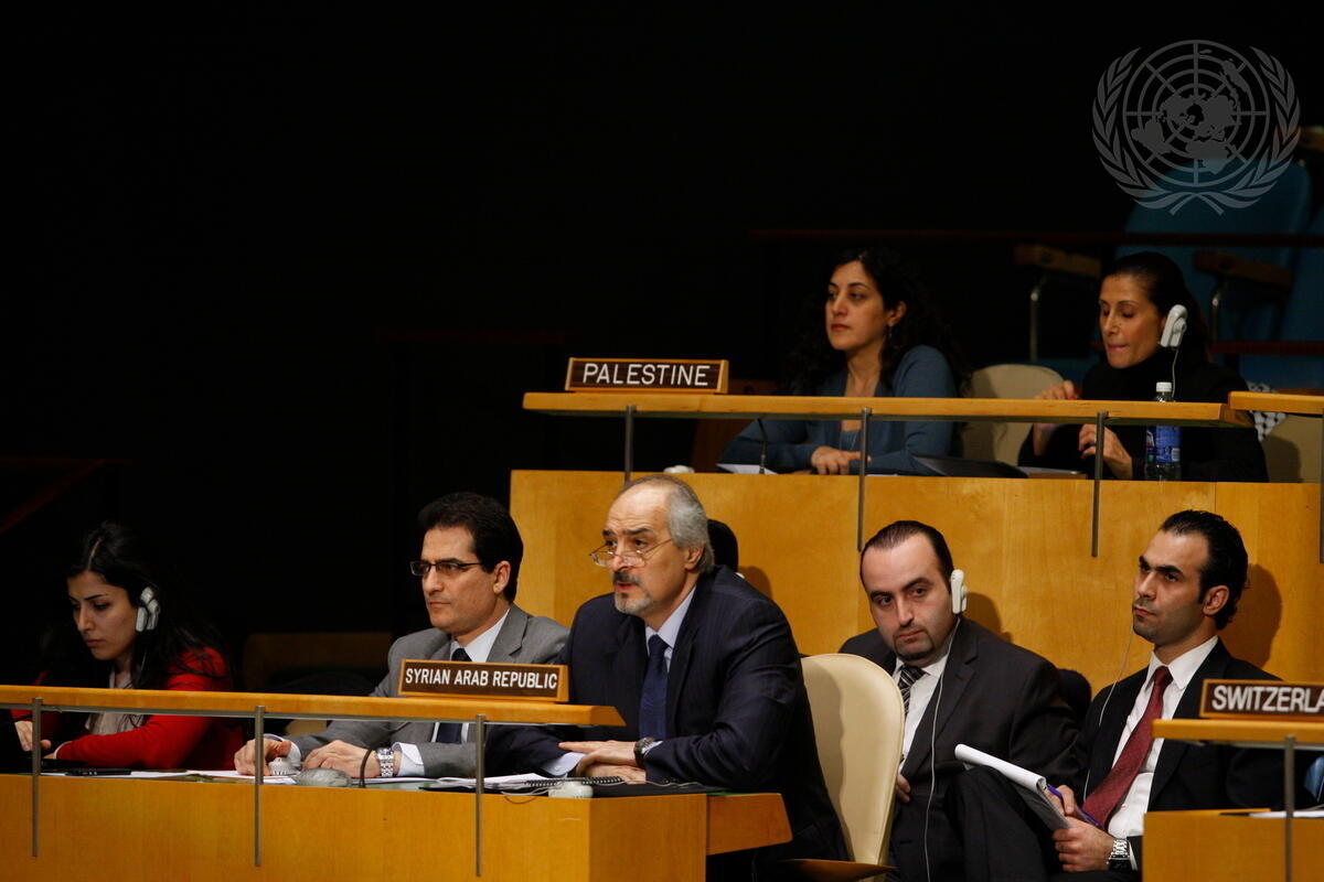 Bashar Ja’afari (front, right), Permanent Representative of Syria to the UN, speaks during the General Assembly’s meeting to consider a draft resolution on the situation in his country. The resolution, which strongly condemns the abuses by the Syrian Government against its people and demands an end to all violence, was adopted by the Assembly with an overwhelming majority.