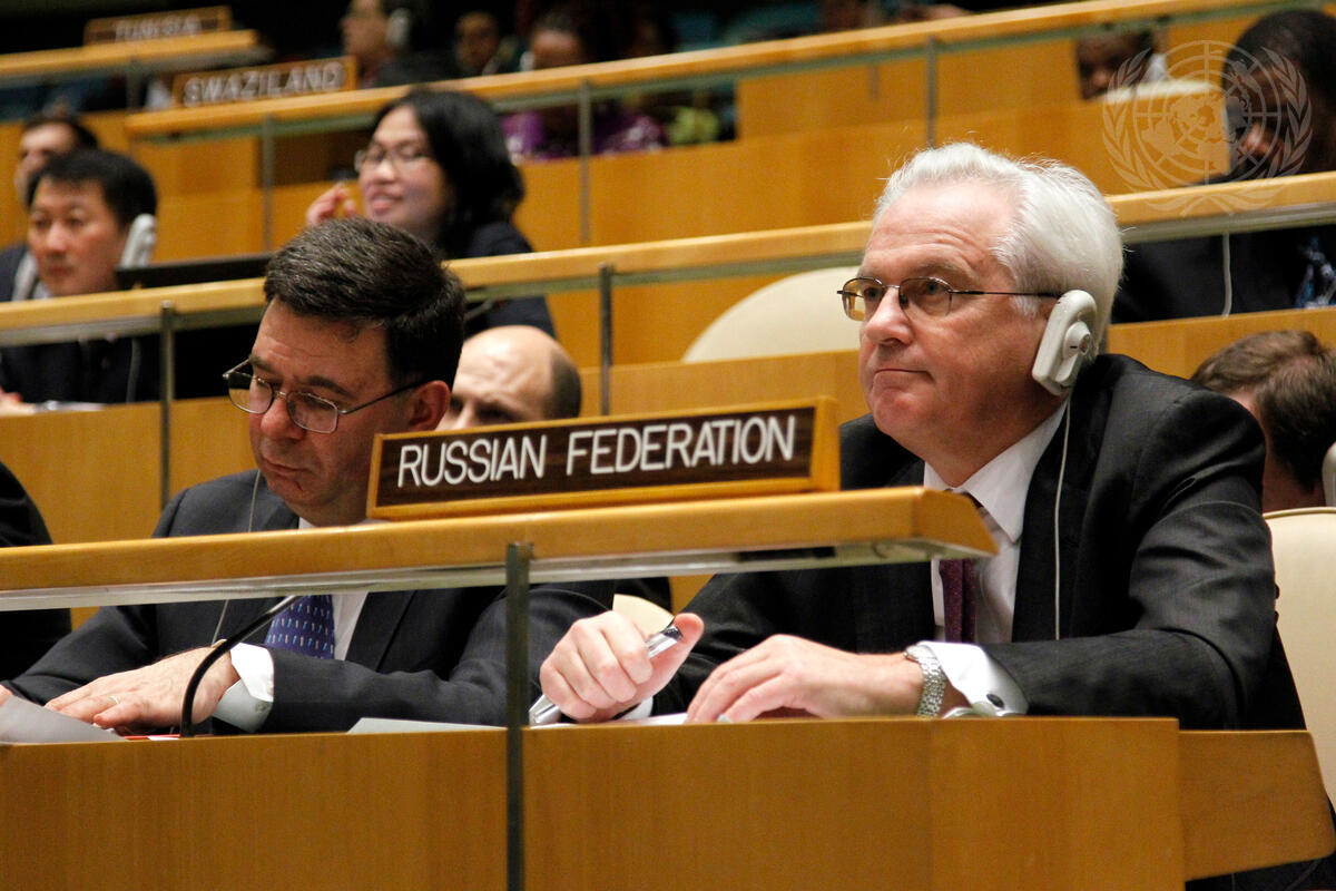 Vitaly I. Churkin (left), Permanent Representative of the Russian Federation to the UN, listens during the General Assembly’s meeting to consider a draft resolution on the situation in Syria. The resolution, which strongly condemns the abuses by the Syrian Government against its people and demands an end to all violence in the country, was voted against by the Russian Federation but passed with an overwhelming majority.