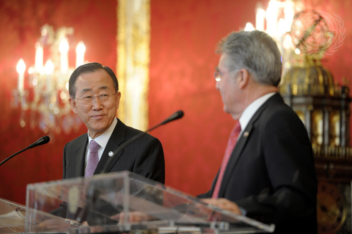 Secretary-General Ban Ki-moon (left) and Heinz Fischer, Federal President of Austria, hold a joint press conference following their meeting, in Vienna.