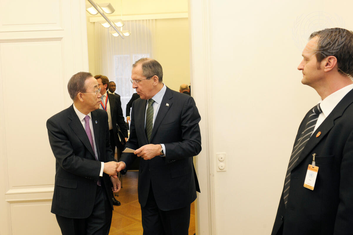 Secretary-General Ban Ki-moon (centre left) meets with Sergey V. Lavrov, Minister for Foreign Affairs of the Russian Federation, in Vienna, Austria.