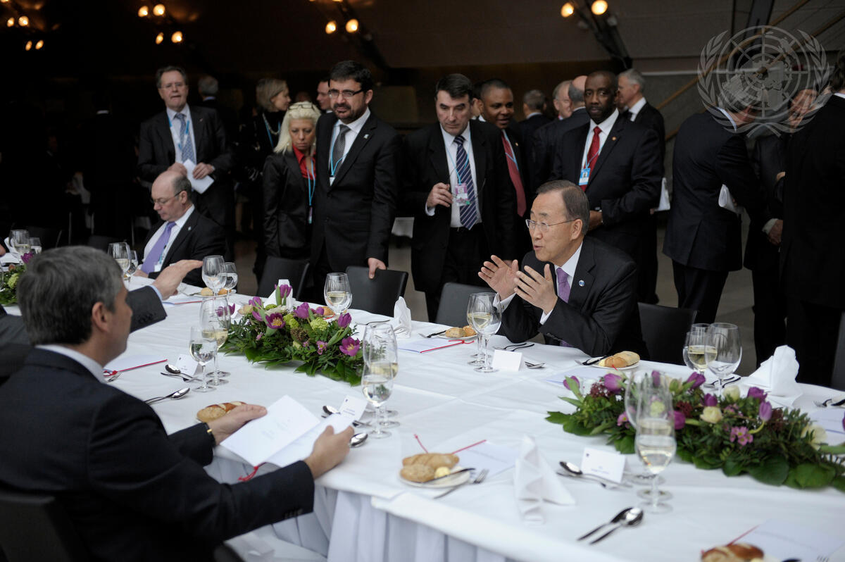 Secretary-General Ban Ki-moon (seated right) is shown during working luncheon with the heads of delegation attending the Third Ministerial Conference of the Paris Pact Partners on Combating the Afghan Illicit Opiate Trade, in Vienna, Austria.