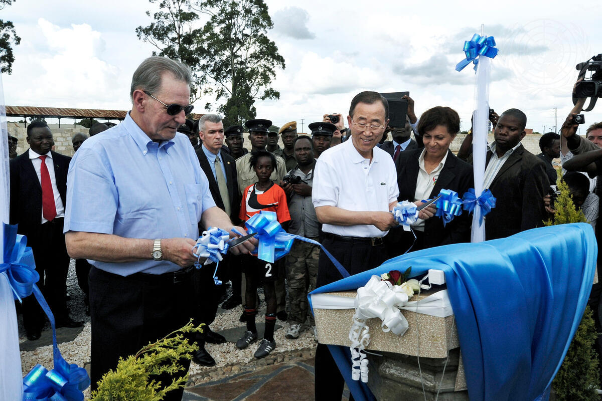 Secretary-General Ban Ki-moon (right, in white shirt) and Jacques Rogge (front, left) President of the International Committee (IOC) unveil an official UN and IOC plaque at the Olympic Youth Development Centre in Lusaka, Zambia. The centre was opened by the Committee in 2010.
