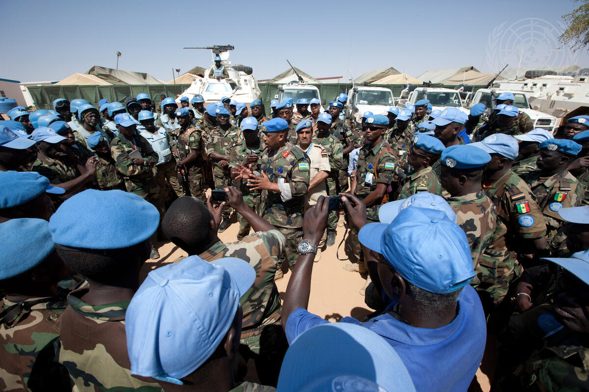 Lieutenant General Patrick Nyamvumba (centre), Force Commander of the African Union-UN Hybrid Operation in Darfur (UNAMID), speaks with the fifty Senegalese peacekeepers who were blockaded by the rebel Justice and Equality Movement (JEM) three days ago in Shegeg Tovev, some 60 kilometres from the UNAMID team site in Umm Baru, North Darfur.