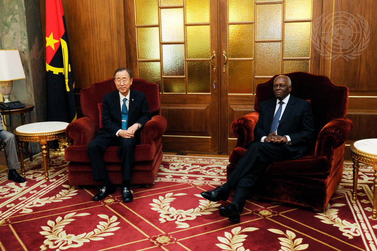 Secretary-General Ban Ki-moon (left) meets with José Eduardo dos Santos, President of Angola, at the Presidential Palace in Luanda.