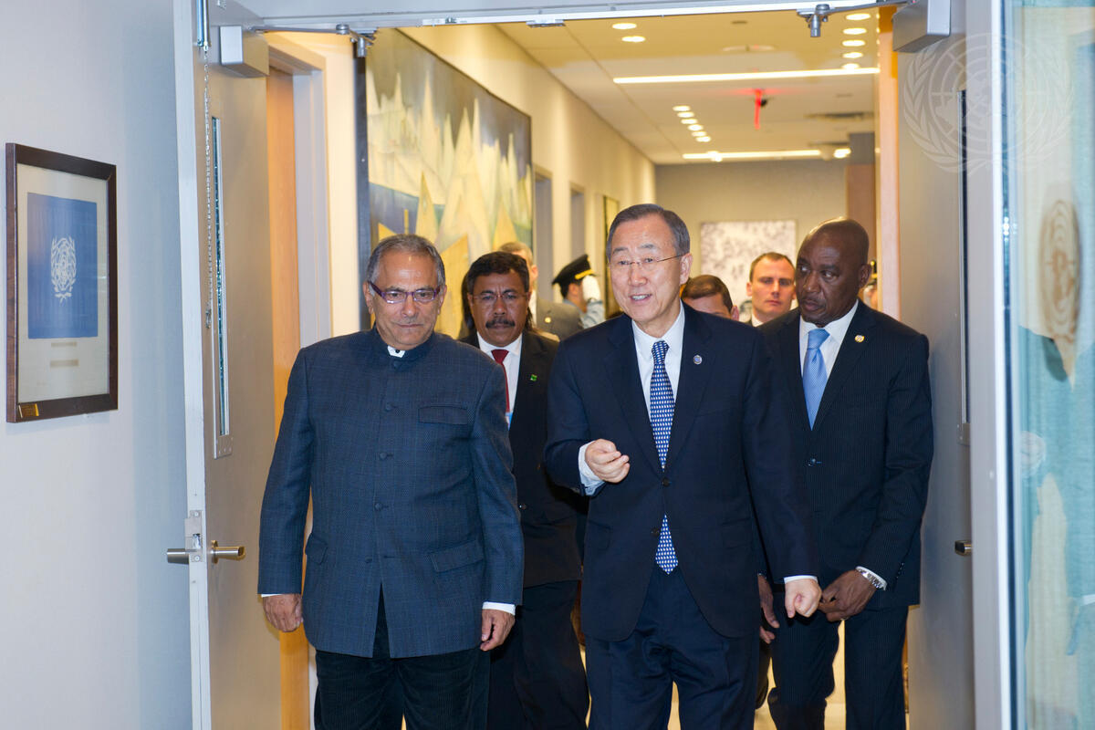 Secretary-General Ban Ki-moon (centre) and José Ramos-Horta (front, left), President of Timor-Leste, are pictured en route to their meeting at UN Headquarters, accompanied by Chief of Protocol Desmond Parker (front, right).