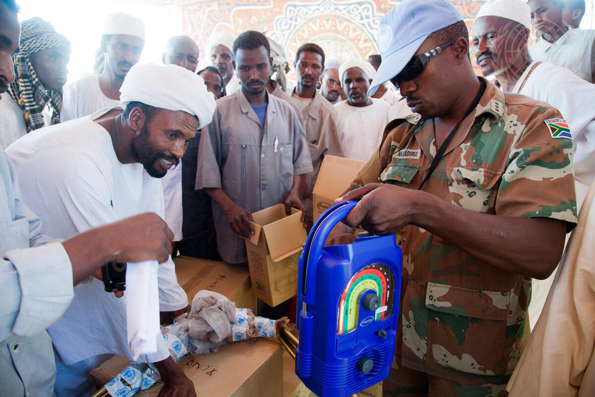 A peacekeeper with African Union-UN Hybrid Operation in Darfur (UNAMID) delivers a radio to members of the Mahammid community in Damra Toma, North Darfur, Sudan. The Mahammids, an Arab nomadic group, have just returned to this area after spending nine years in displacement in camps across South Darfur. One thousand Mahammid households originally fled in 2002, and two hundred are expected to resettle here in the coming days.