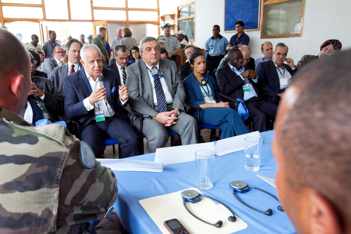 Mohammed Loulichki (front, left), Permanent Representative of Morocco to the UN and Member of the Security Council, speaks during Council Members’ meeting with officials of the UN Stabilization Mission in Haiti (MINUSTAH) and the Haitian National Police in Miragoâne. The Members pictured with Mr. Loulichki (from left, front row): Agshin Mehdiyev (Azerbaijan); Susan Rice (United States); Kodjo Menan (Togo); and José Filipe Moraes Cabral (Portugal).