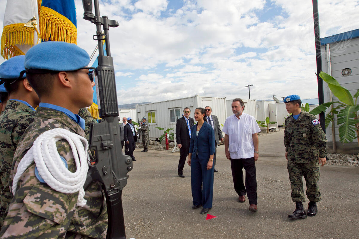 Peacekeepers from the Republic of Korea, serving with the UN Stabilization Mission in Haiti (MINUSTAH), stand at attention as Members of the Security Council, including Susan Rice (front, third from right) of the United States, visit their base in Miragoâne. The Council Members also got a firsthand look at the Korean contingent’s engineering project.