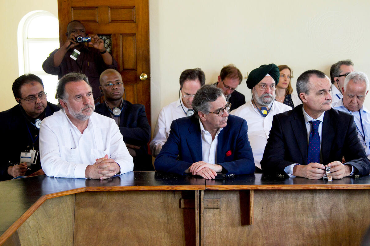 Members of the Security Council and Mariano Fernández (front, left), Head of the UN Stabilization Mission in Haiti (MINUSTAH), meet with local officials in in the northern city of Cap-Haïtien as part of the Council’s four-day visit to the country. Among the Council Members pictured (front row, from left): Néstor Osorio (Colombia); and Gérard Araud (France). Second row (from left): Raza Bashir Tarar (Pakistan); Baso Sangqu (South Africa); Philip Parham (United Kingdom); Hardeep Singh Puri (India); and Mohammed Loulichki (Morocco).