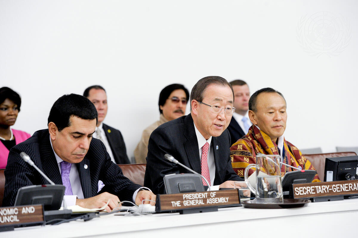 On stage, from left to right, are: Nassir Abdulaziz Al-Nasser, President of the sixty-sixth session of the General Assembly; Mr. Ban; and Lyonchoen Jigmi Yoezer Thinley, Prime Minister of the Kingdom of Bhutan.