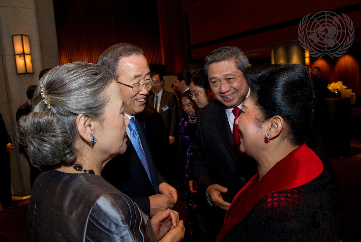 Secretary-General Ban Ki-moon (centre left) and his wife, Yoo Soon-taek (left), meet Susilo Bambang Yudhoyono (centre right), President of Indonesia, and his wife, Kristiani Herawati, at the gala dinner hosted by the President of the Republic of Korea, following the Nuclear Security Summit, in Seoul.
