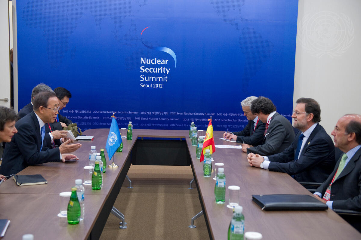 Secretary-General Ban Ki-moon (second from left) meets with Mariano Rajoy Brey (second from right), Prime Minister of Spain, at the 2012 Nuclear Security Summit in Seoul, Republic of Korea.