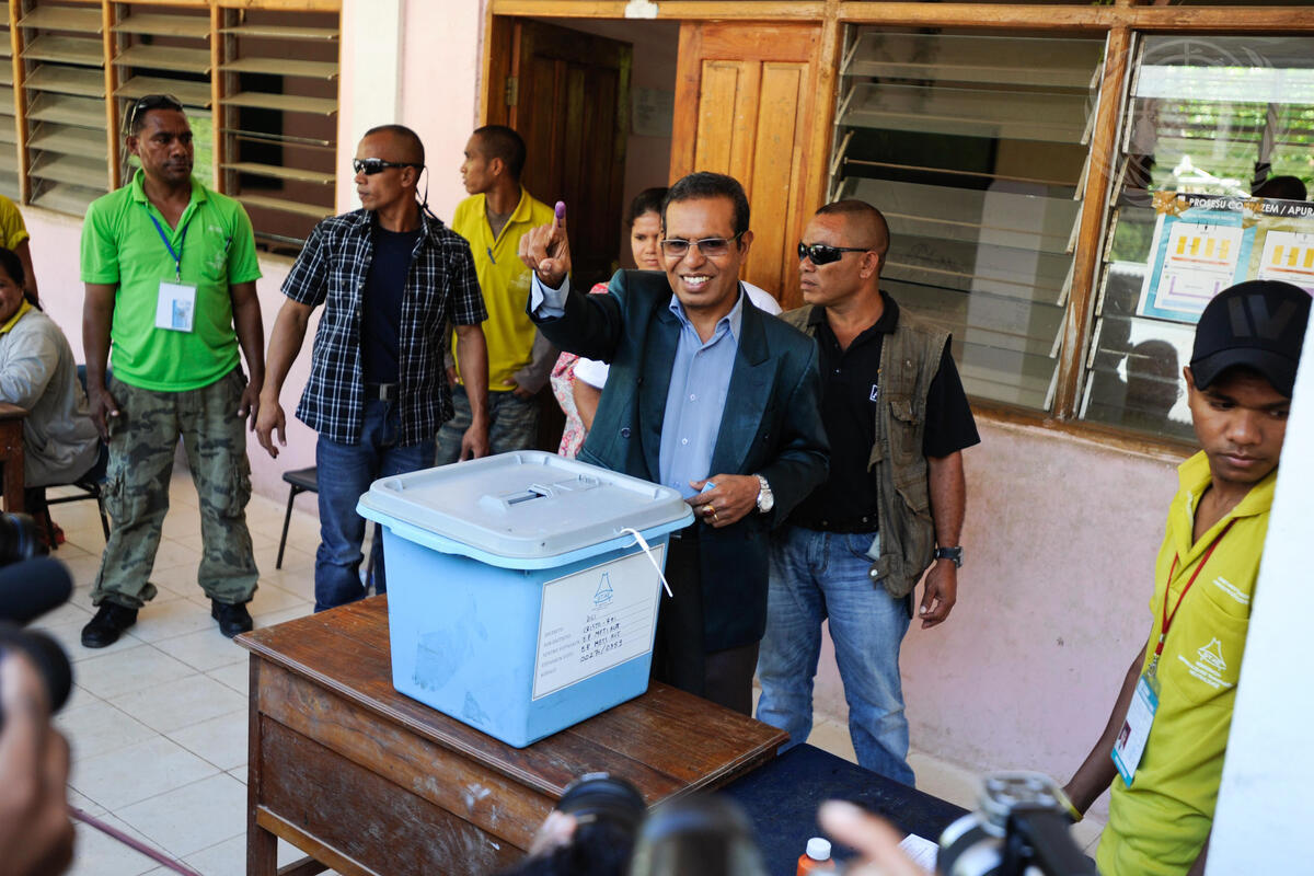Presidential candidate Taur Matan Ruak (centre) casts his ballot during the second round of presidential elections in Timor-Leste.