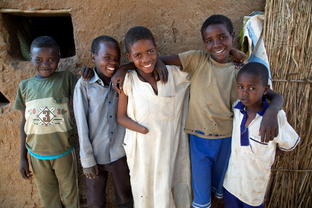 Twelve-year-old, Abdurrahim Ahmed Mohamed poses with his friends in front of his house in Al Salam camp for displaced persons (from left to right): Maggi Issa, Mohammed Abdalla, Abdurrahim, Jamil Ala Abbakar, and Faris Kharoum. In 2008, Abdurrahim lost his right hand and the sight in his left eye when he and his friends played with unexploded ordnance (UXO) found near his house in their village.