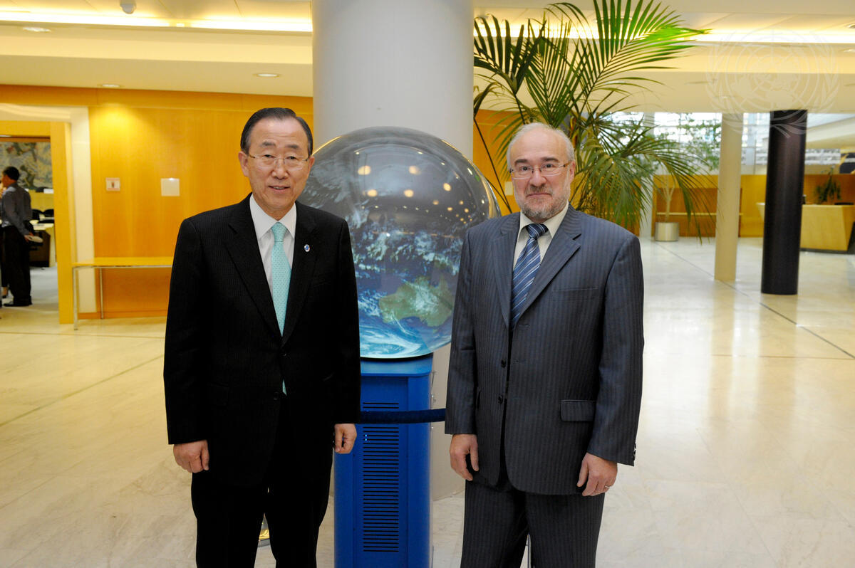 Secretary-General Ban Ki-moon (left) meets with Michel Jarraud, Secretary-General of the World Meteorological Organization (WMO), at the WMO’s headquarters in Geneva, Switzerland.