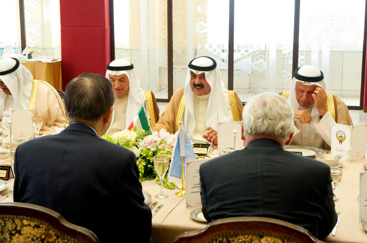 Secretary-General Ban Ki-moon (left, back to camera) meets with Khaled Al-Jarallah (speaking), Undersecretary for Foreign Affairs of Kuwait, in Kuwait City.