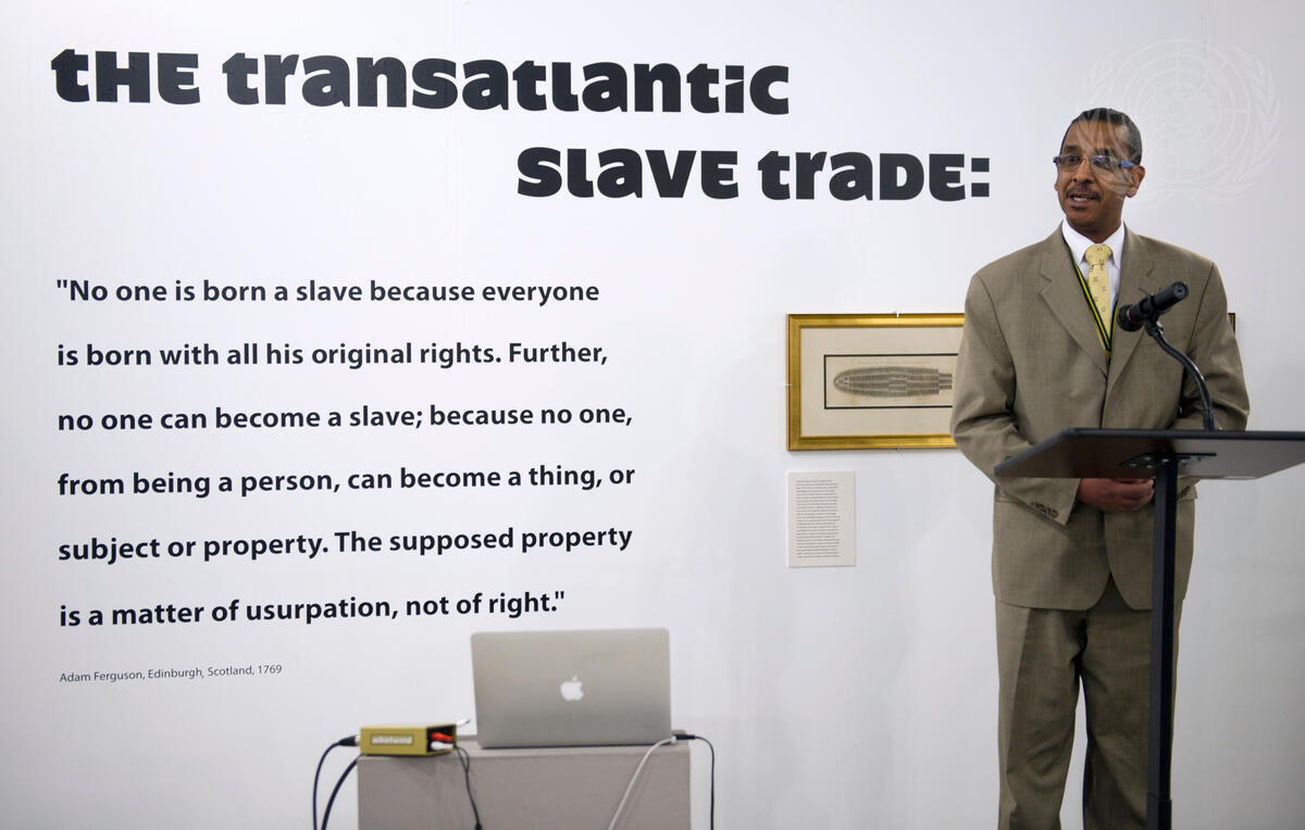 Raymond O. Wolfe, Permanent Representative of Jamaica to the UN, speaks at the opening of a multimedia exhibit on the Transatlantic Slave Trade marking this year’s International Day of Remembrance of the Victims of Slavery and the Transatlantic Slave Trade.