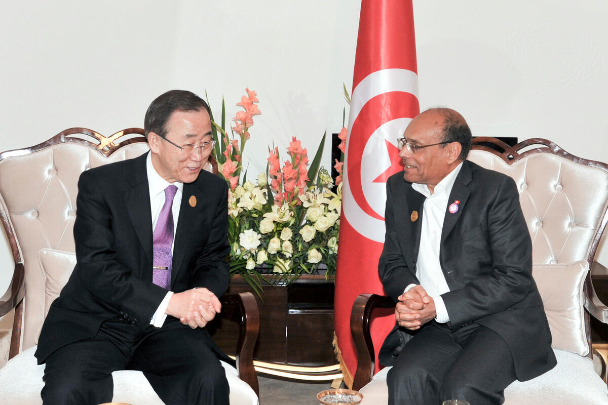 Secretary-General Ban Ki-moon (left) meets with Moncef Marzouki, President of Tunisia, on the sidelines of the annual League of Arab States summit in Baghdad, Iraq.
