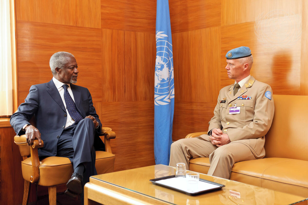 The UN and Arab League’s Joint Special Envoy for Syria, Kofi Annan (left), meets with Major General Robert Mood of Norway, who has been appointed to lead a technical team from the UN to Syria.