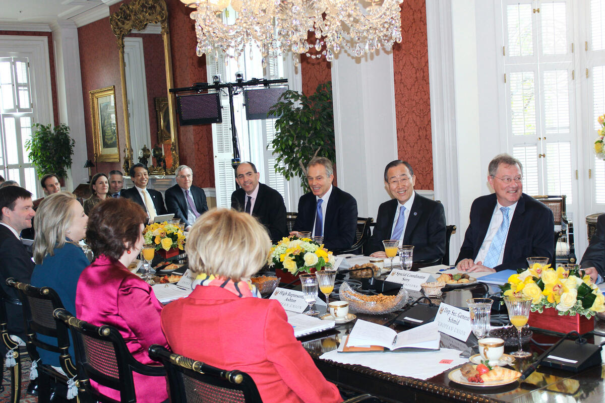 Mr. Ban was joined by fellow Quartet Members Catherine Ashton, the European Union High Representative for Foreign Affairs and Security Policy; Tony Blair (pictured left of Mr. Ban), Special Envoy of the Quartet; Hillary Rodham Clinton, United States Secretary of State; and Russian Foreign Minister Sergey Lavrov; as well as Jordanian Foreign Minister Nasser Judeh, and Robert H. Serry (right of Mr. Ban), UN Special Coordinator for the Middle East Peace Process.