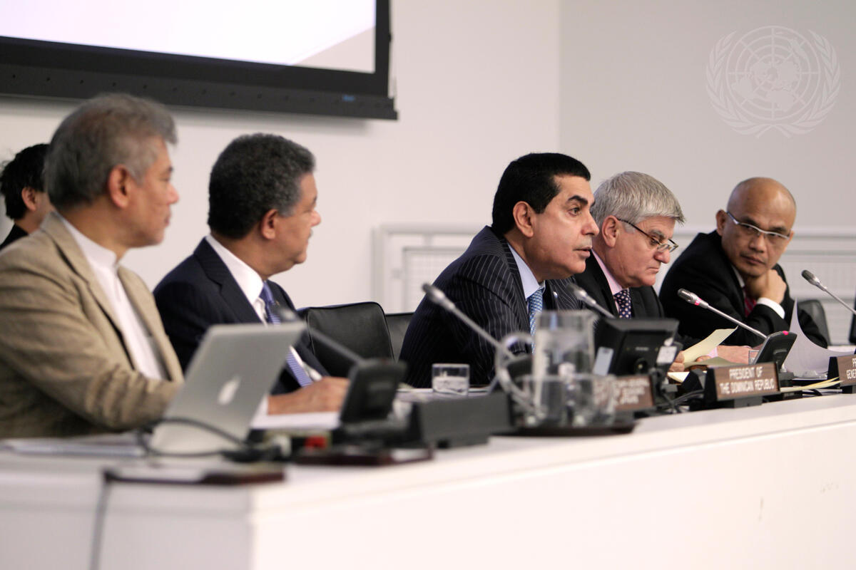 Nassir Abdulaziz Al-Nasser (centre), President of the sixty-sixth session of the General Assembly, delivers introductory remarks at the Assembly’s thematic debate, titled, “Addressing Excessive Price Volatility in Food and Related Financial and Commodity Markets”. He is joined by (from left) Jomo Kwame Sundaram, Assistant-Secretary-General for Economic Development; Leonel Fernández Reyna, President of the Dominican Republic; Ion Botnaru, Director of the General Assembly and the Economic and Social Council (ECOSOC) Affairs Division; and Desra Percaya, Permanent Representative of Indonesia to the UN and Acting President of ECOSOC.