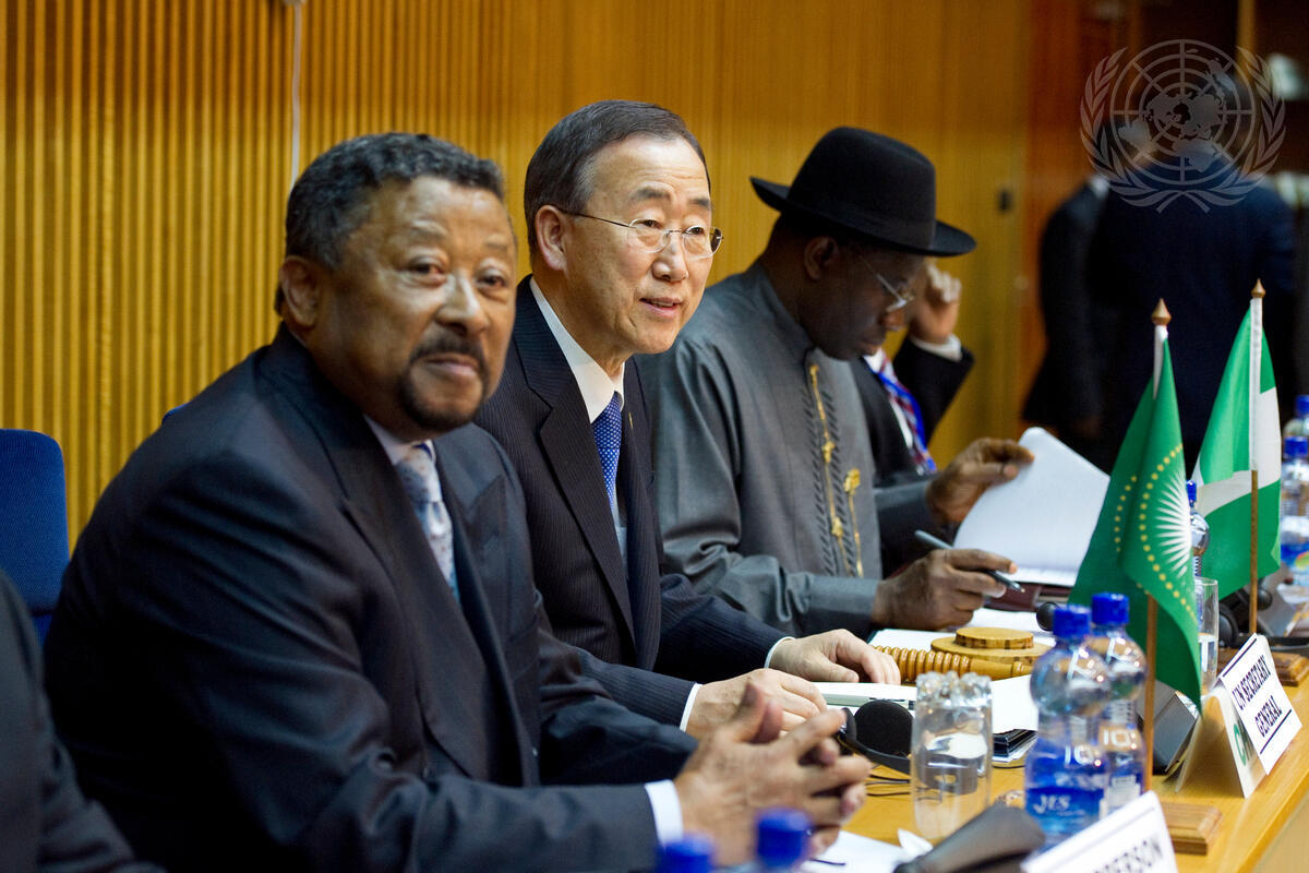 Secretary-General Ban Ki-moon (centre) attends a high-level meeting on Côte D’Ivoire on the margins of the African Union Summit this week in Addis Abba. Mr. Ban is seated between Jean Ping (left), Chairperson of the Commission of the African Union, and Goodluck Jonathan, President of Nigeria.
