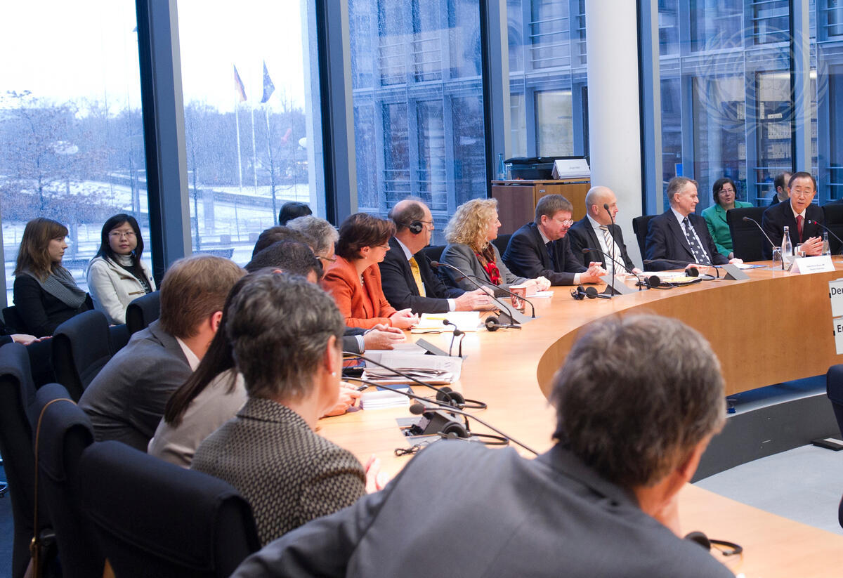 Secretary-General Ban Ki-moon (right, facing camera) addresses the Foreign Affairs Committee of the Bundestag, the German lower house of Parliament, in Berlin, Germany. Pictured with Mr. Ban is Hans-Ulrich Klose (second from right), Deputy Chairman of the Committee.