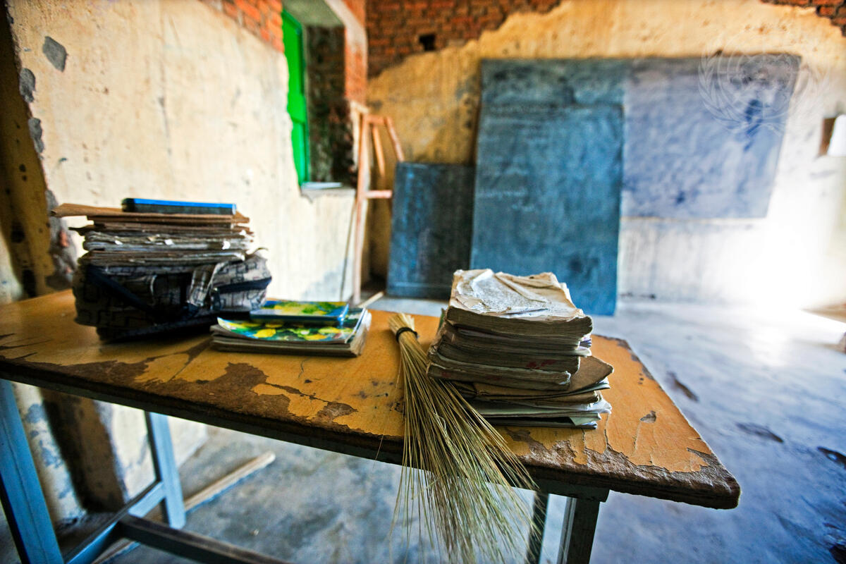 A close-up of a desk and books inside a classroom at Oumoul Mouminina School in Forobaranga, West Darfur, Sudan. The school received a visit from Ibrahim Gambari, Joint Special Representative for the African Union-United Nations Hybrid Operation in Darfur (UNAMID).