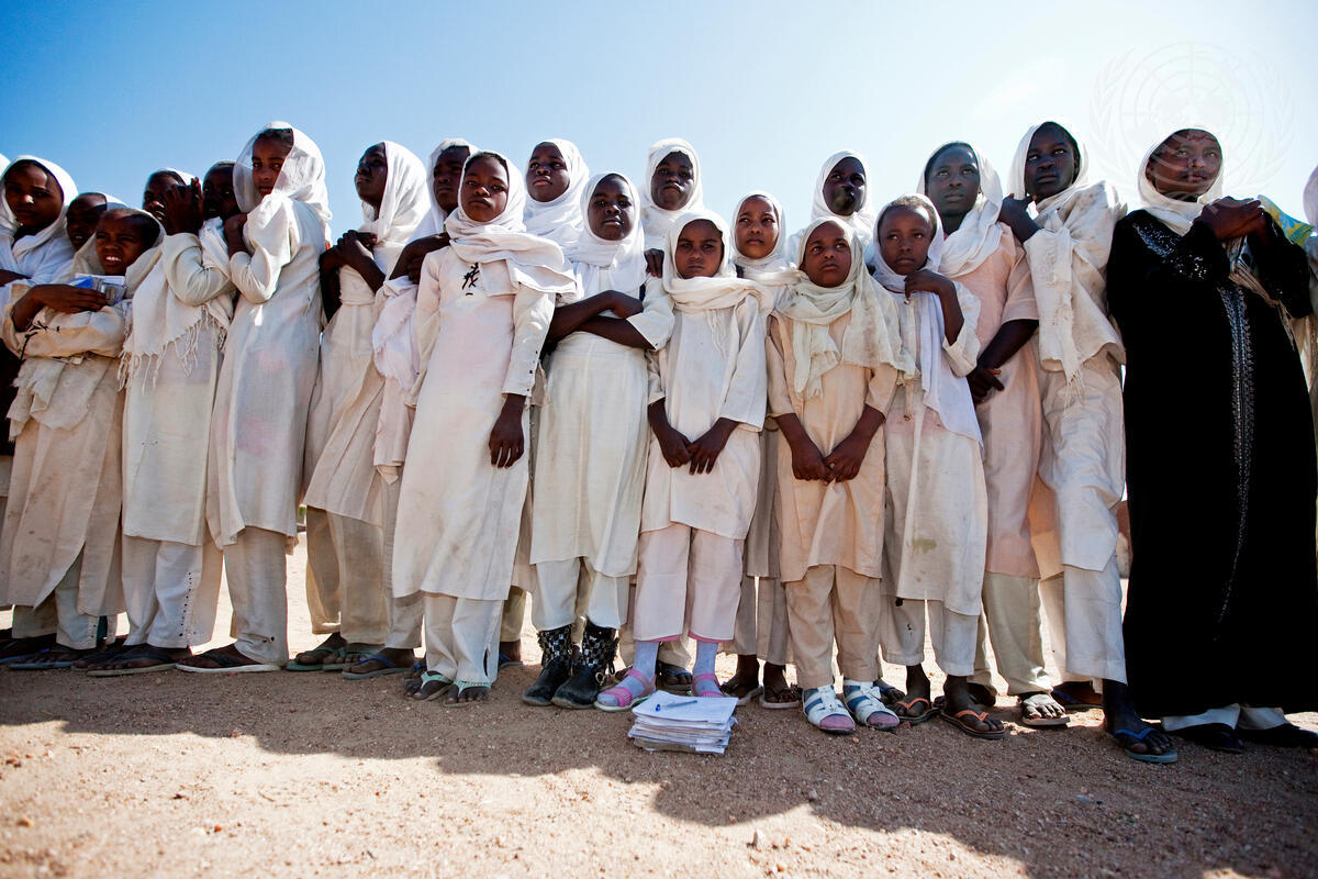 Students of the Oumoul Mouminina School in Forobaranga, West Darfur, Sudan, gather for a visit from Ibrahim Gambari, Joint Special Representative for the African Union-United Nations Hybrid Operation in Darfur (UNAMID).