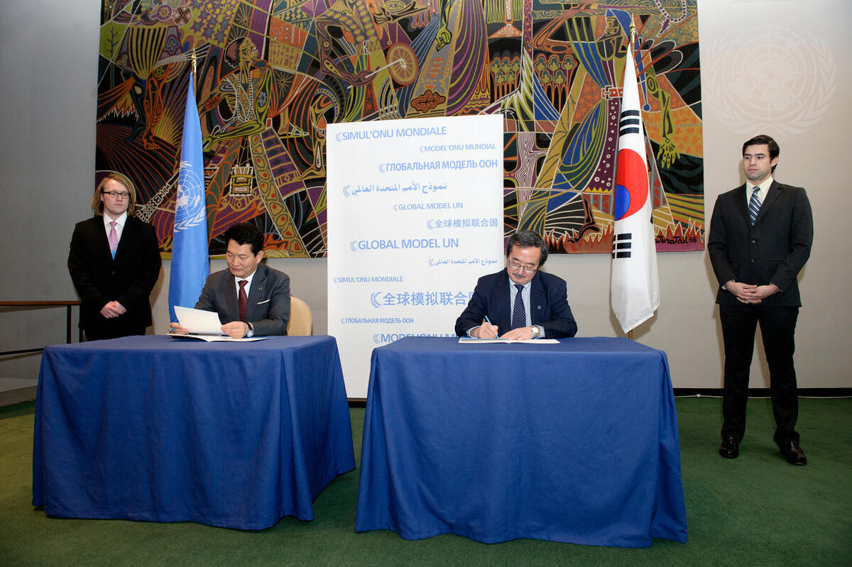 Kiyotaka Akasaka (right), Under-Secretary-General for Communications and Public Information, and Song Young-gil, Mayor of Incheon, Republic of Korea, sign an agreement recognizing Incheon’s hosting of the 2011 Global Model United Nations (GMUN) Conference.