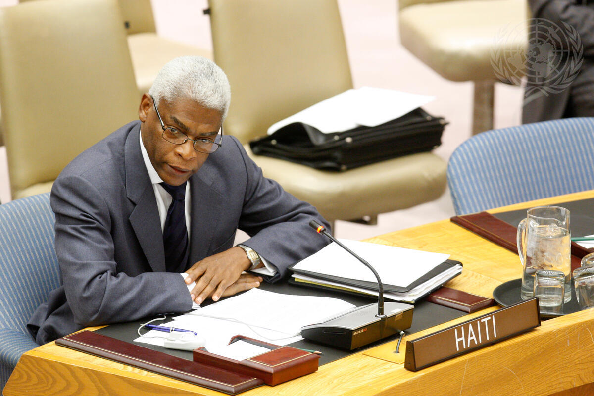 Jean Wesley Cazeau, Deputy Permanent Representative of Haiti to the UN, addresses a meeting of the Security Council on his country at which Under-Secretary-Generals for Peacekeeping and Humanitarian Affairs, Alain Le Roy and Valerie Amos, delivered briefings.