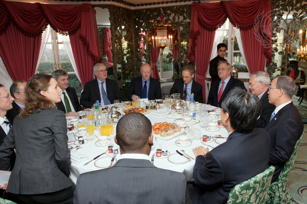 Secretary-General Ban Ki-moon (right) attends a breakfast meeting with Chris Huhne (head table left, in green tie), Secretary of State for Energy and Climate Change of the United Kingdom, in London. Also pictured: B. Lynn Pascoe (left of Mr. Ban), Under-Secretary-General for Political Affairs; Martin Nesirky (fourth from right), Spokesperson for Mr. Ban; and Mark Lyall Grant (right of Mr. Huhne), Permanent Representative of the United Kingdom to the UN.