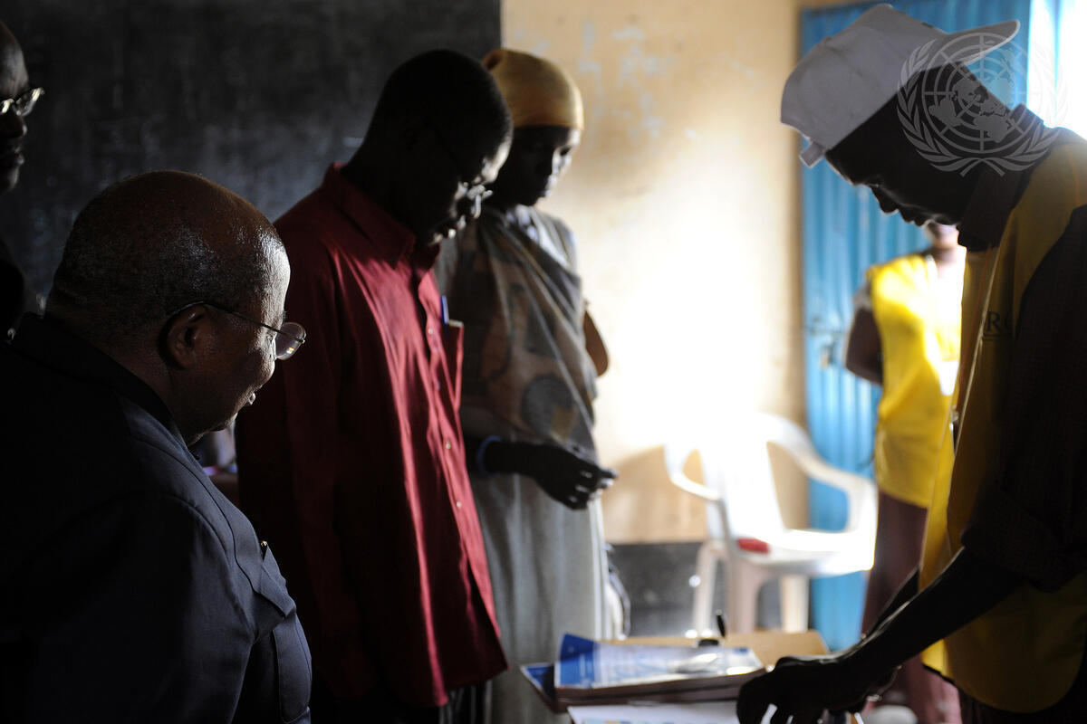 Benjamin Mkapa (left, back to camera), former President of Tanzania and Chair of the UN Secretary-General’s Panel on the Referenda in Sudan, observes the process for voting in the Southern Sudan referendum at a polling station in North Bari, near Juba, the South's capital, on the first day of balloting. Mr. Mkapa and the rest of the Panel visited a number of polling centres in and around Juba for similar observation.