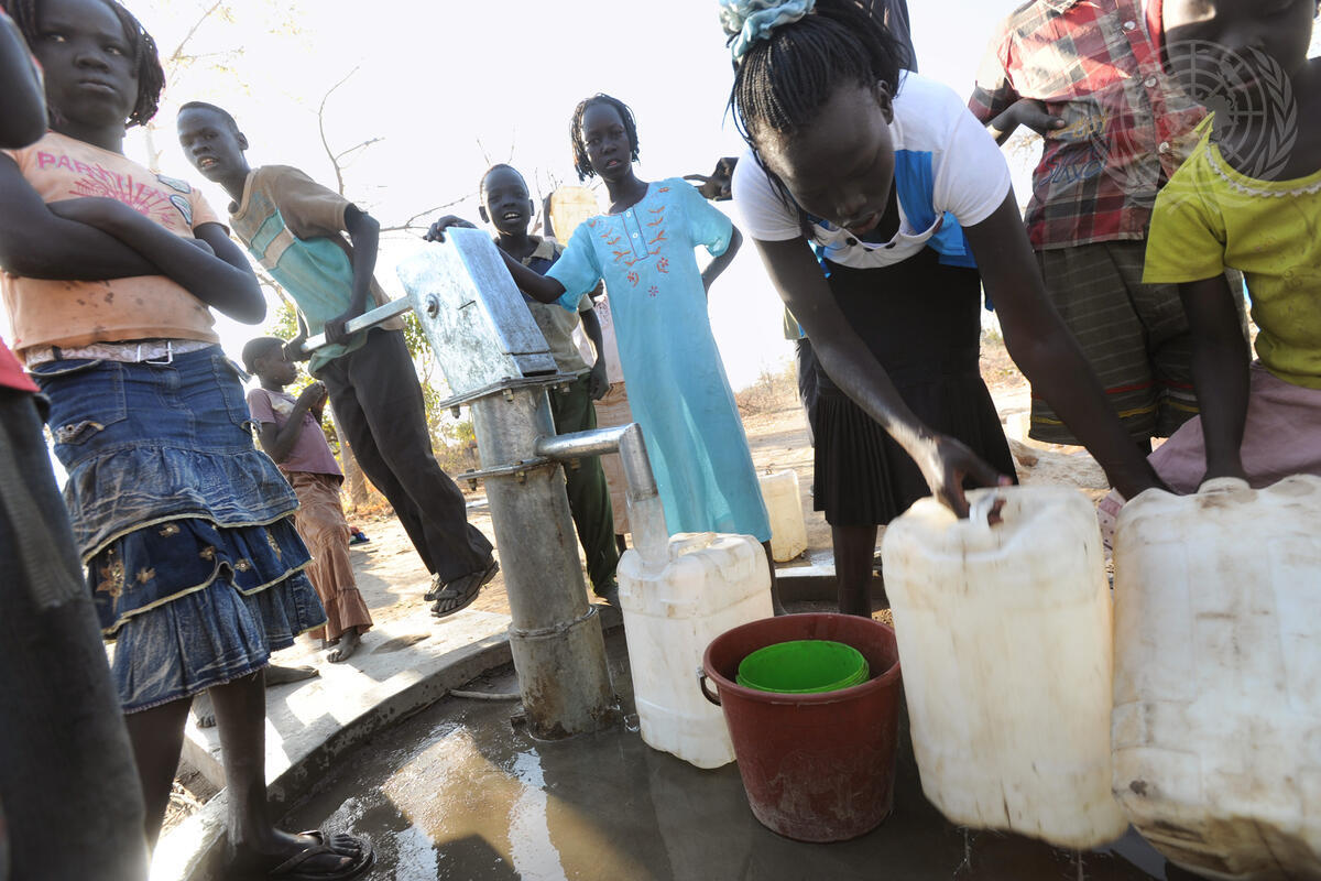 Young Southern Sudanese returnees collect water from a communal pump in the Udhaba/Apada area near Aweil, Northern Bahr el Ghazal State, South Sudan. Since 1 December 2010 the area has seen the return of 10,000 South Sudanese, with the International Organization for Migration (IOM) registering approximately 50,000 returnees state-wide over the same period.