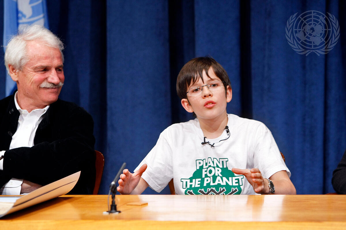 Felix Finkbeiner (right) of the “Plant-for-the-Planet Children Initiative” briefs correspondents at a press conference on the International Forest Film Festival, one of the events in 2011 to raise awareness on forest conservation. At left is international filmmaker Yann Arthus-Bertrand.
