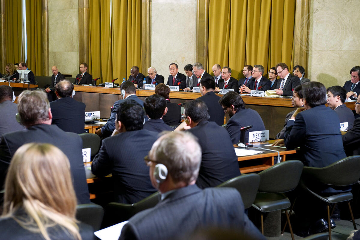 Secretary-General Ban Ki-moon (head table, third from left) attends the newly-opened 2011 session of the UN Conference on Disarmament in Geneva, Switzerland. Mr. Ban is flanked by Sergio de Queiroz Duarte (second from left), UN High Representative for Disarmament, and Marius Grinius, Permanent Representative of Canada to the UN Office at Geneva and President of the Conference.