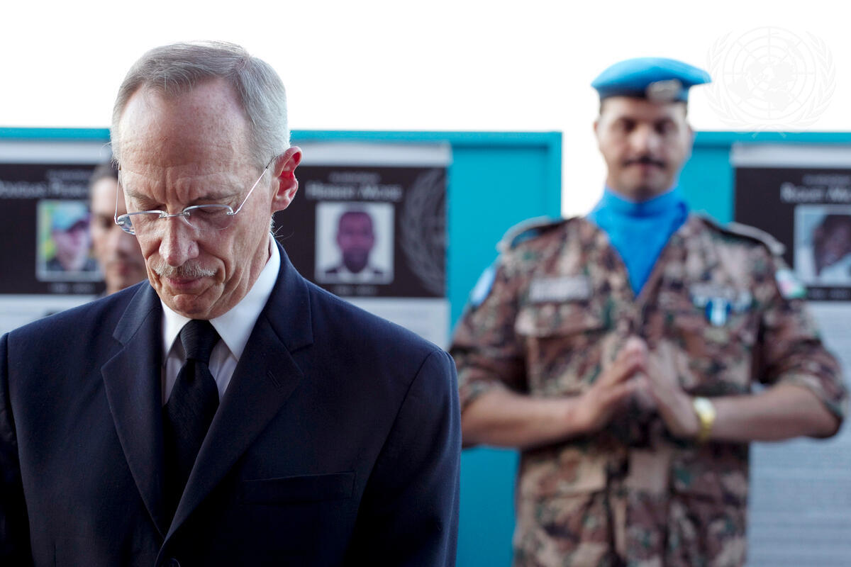 Edmond Mulet (front), Special Representative of the Secretary-General for Haiti, solemnly pays tribute to the 102 UN staff members who perished in Haiti’s earthquake during a memorial service on the one-year anniversary of the earthquake, in Haitian capital, Port-au-Prince.