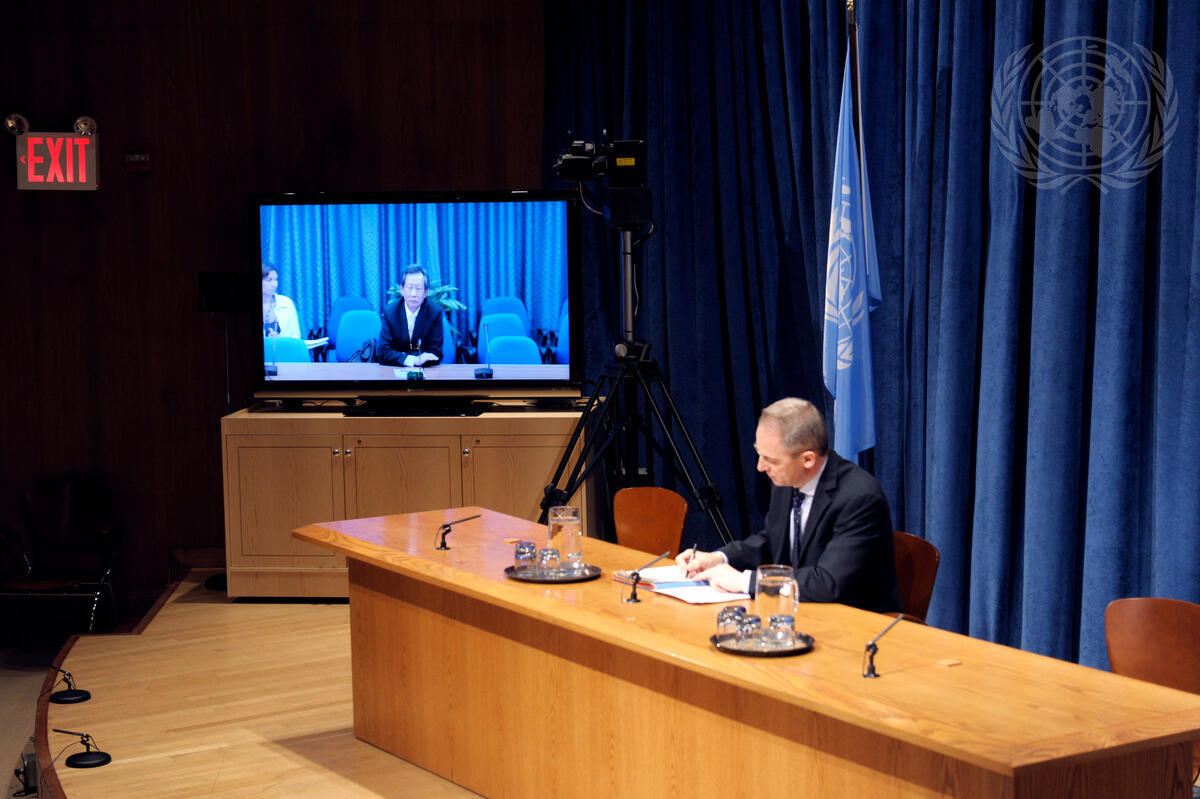 Choi Young-Jin (on screens), Special Representative of the Secretary-General for Côte d'Ivoire, briefs correspondents via video link on the situation in that country. Côte d'Ivoire has experienced political turmoil and rashes of violence since its former President, Laurent Gbagbo, has refused to accept his loss in the November 2010 elections. Pictured at the briefing with Mr. Choi is Martin Nesirky, Spokesperson for Secretary-General Ban Ki-moon.