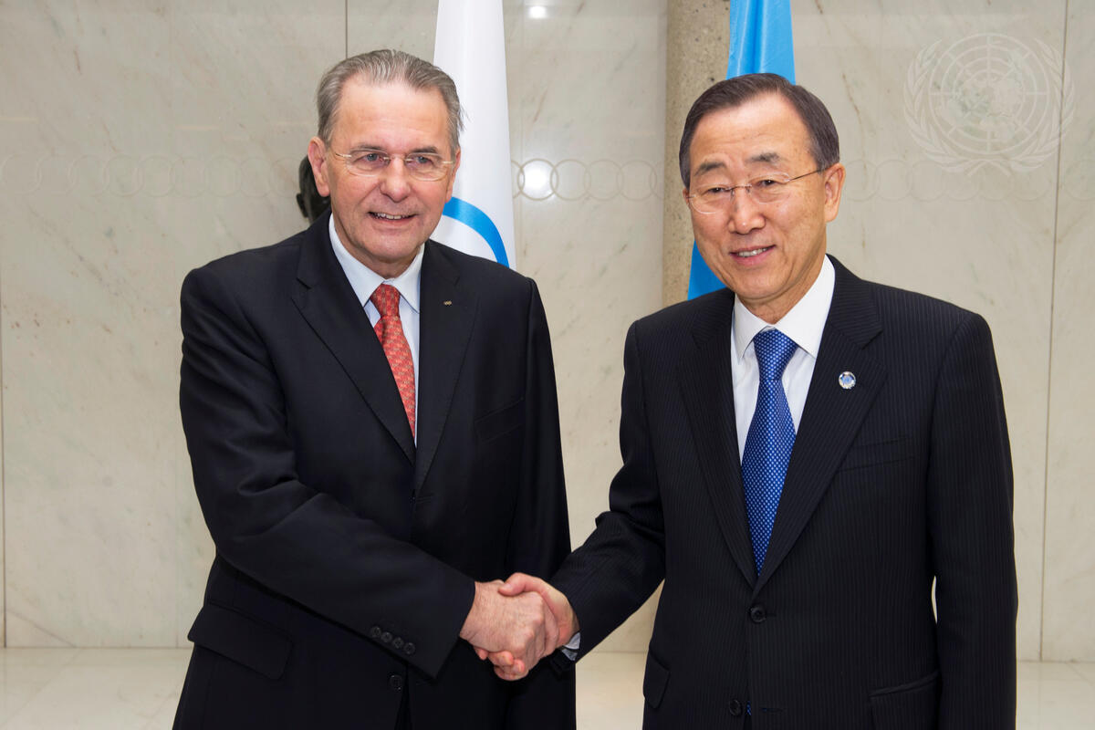 Secretary-General Ban Ki-moon (right) is greeted by Jacques Rogge, President of the International Olympic Committee (IOC), at the Committee’s headquarters in Lausanne, Switzerland.