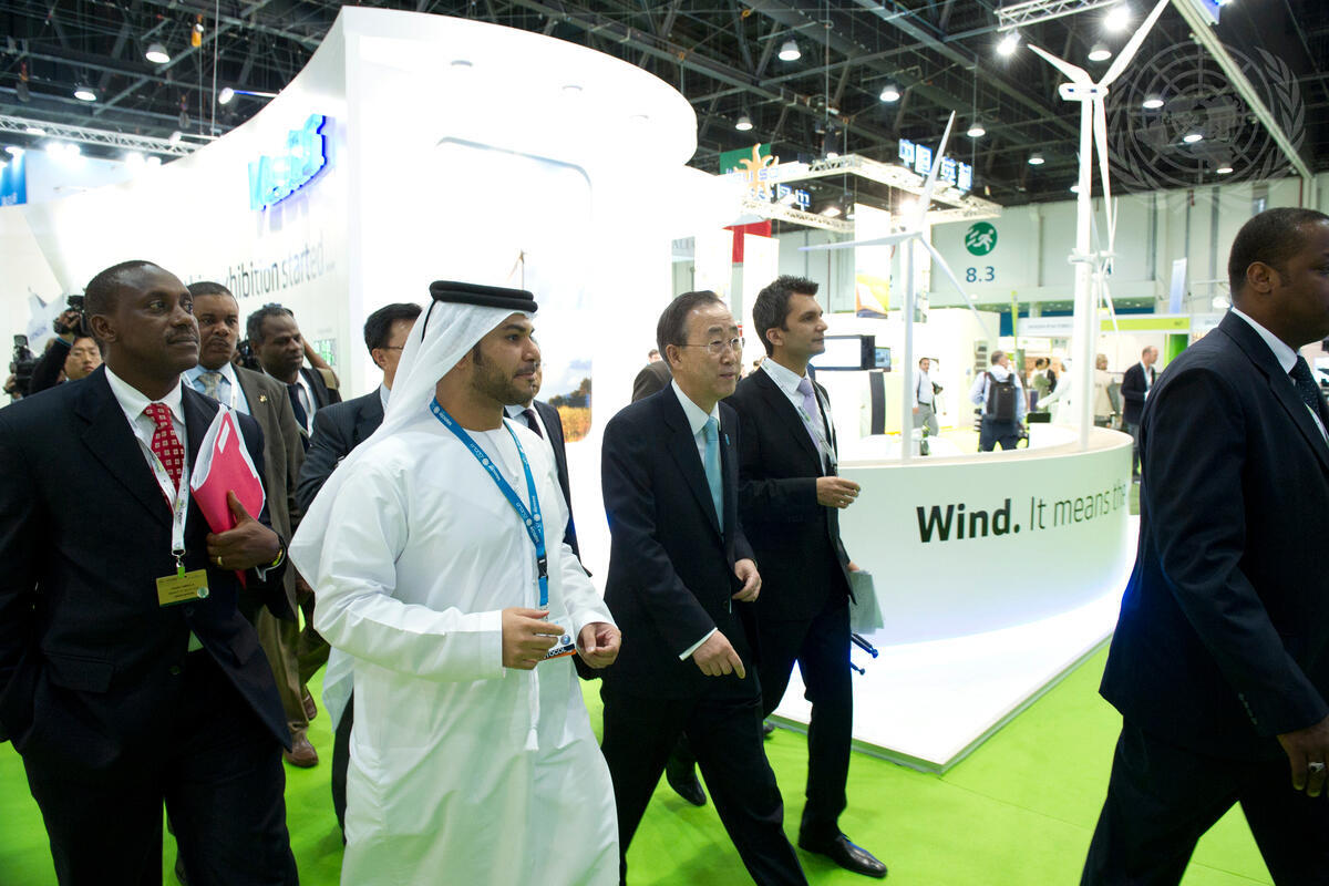 Secretary-General Ban Ki-moon (front, centre) tours exhibits on renewable energy, energy-smart technology and other sectors at the 4th World Future Energy Summit in Abu Dhabi, United Arab Emirates.